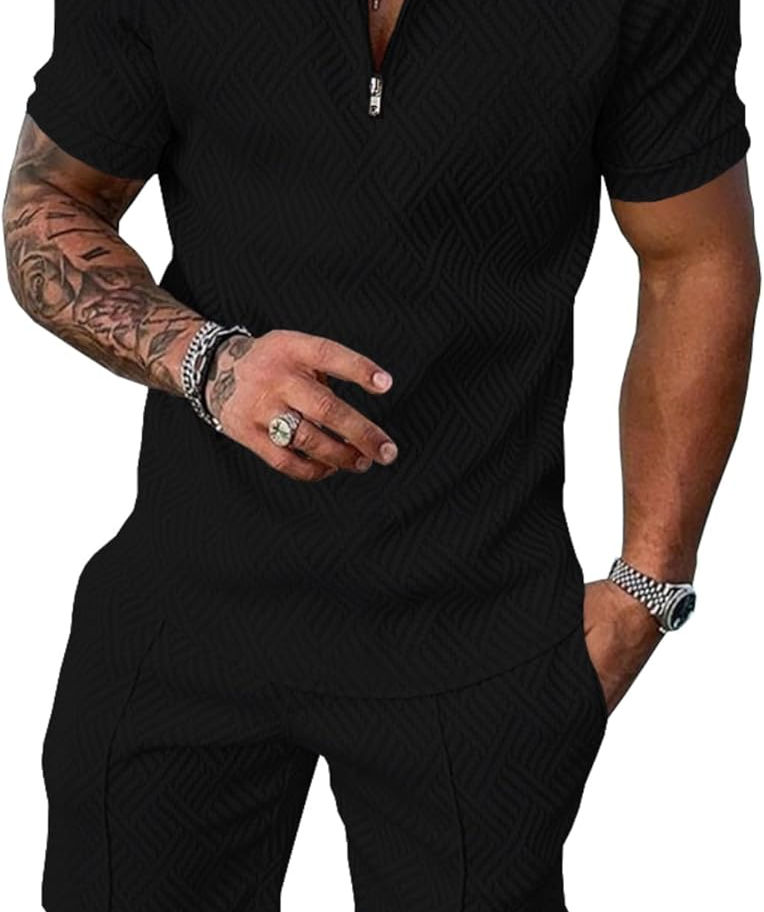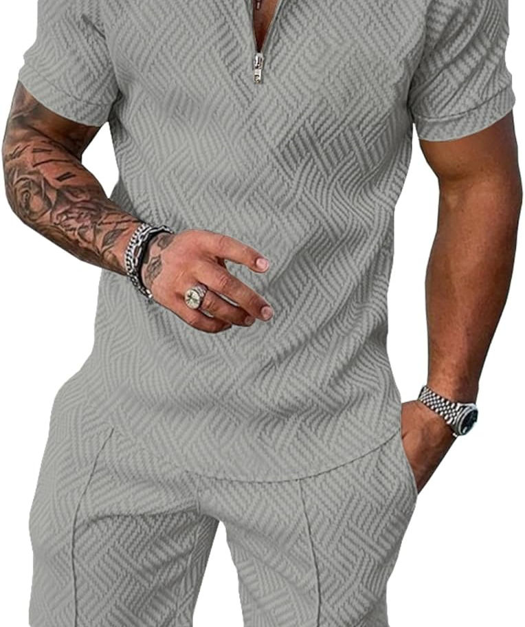 Elegante y atemporal: nuestro conjunto de 2 piezas para hombre es una encarnación del diseño moderno y atemporal, con una artesanía jacquard a rayas 3D. El cuello polo retro y la cremallera frontal añaden sofisticación a tu look, atendiendo a diversos gustos de moda.