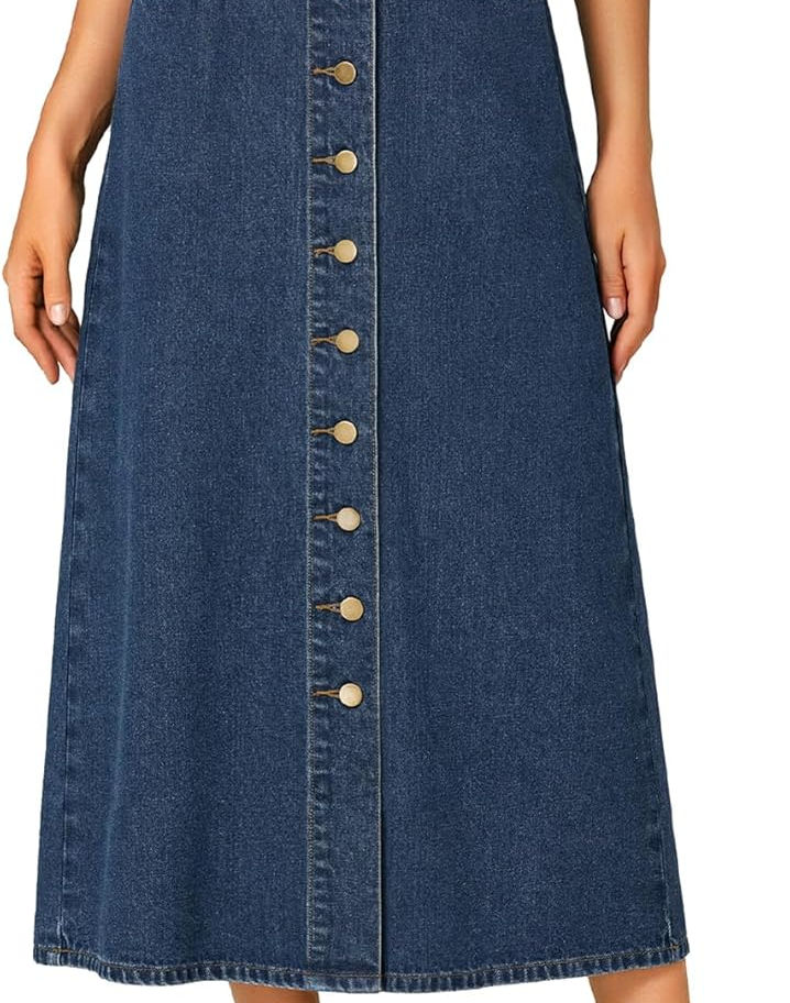 Longitud hasta el tobillo, ajuste regular. Falda de mezclilla de cintura alta para mujer con color liso, detalle de botones y diseño de línea A, favorece perfectamente tus curvas