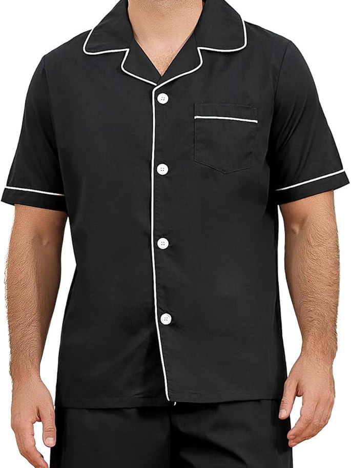 Diseño clásico: este conjunto de pijama de manga corta para hombre cuenta con un práctico botón frontal completo para un fácil uso y extracción. Su elegante solapa de muesca con ribetes en contraste y un ajuste relajado garantizan comodidad durante todo el día mientras equilibra un aspecto elegante y pulido