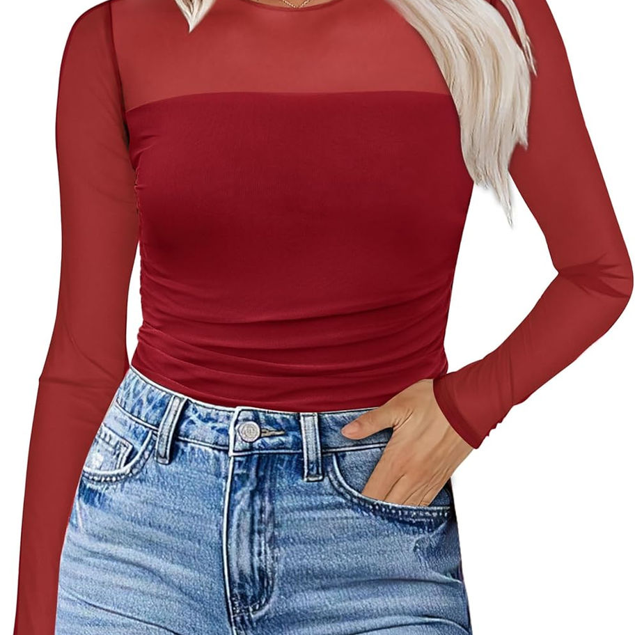 Diseño: esta camiseta de manga larga de malla para mujer combina elegancia con un toque de atractivo, con un cuello redondo y mangas de malla transparente para un aspecto sofisticado. La tela de doble capa y el sutil fruncido crean una silueta que abraza el cuerpo, añade cobertura mientras mantiene un atractivo sexy pero sofisticado.