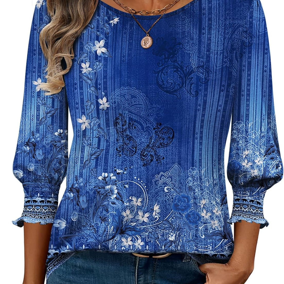 Elegante con detalles favorecedores: cuenta con un cuello redondo atemporal y elegantes mangas 3/4 con delicados puños con volantes, combinando estilo clásico con un toque sofisticado que favorece a todo tipo de cuerpo