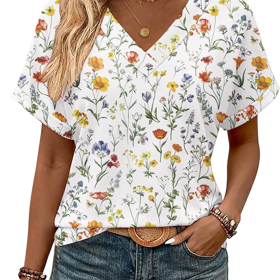 Womens Shirts Short Sleeve Tops V Neck Casual Blouses Floral Print Clothes