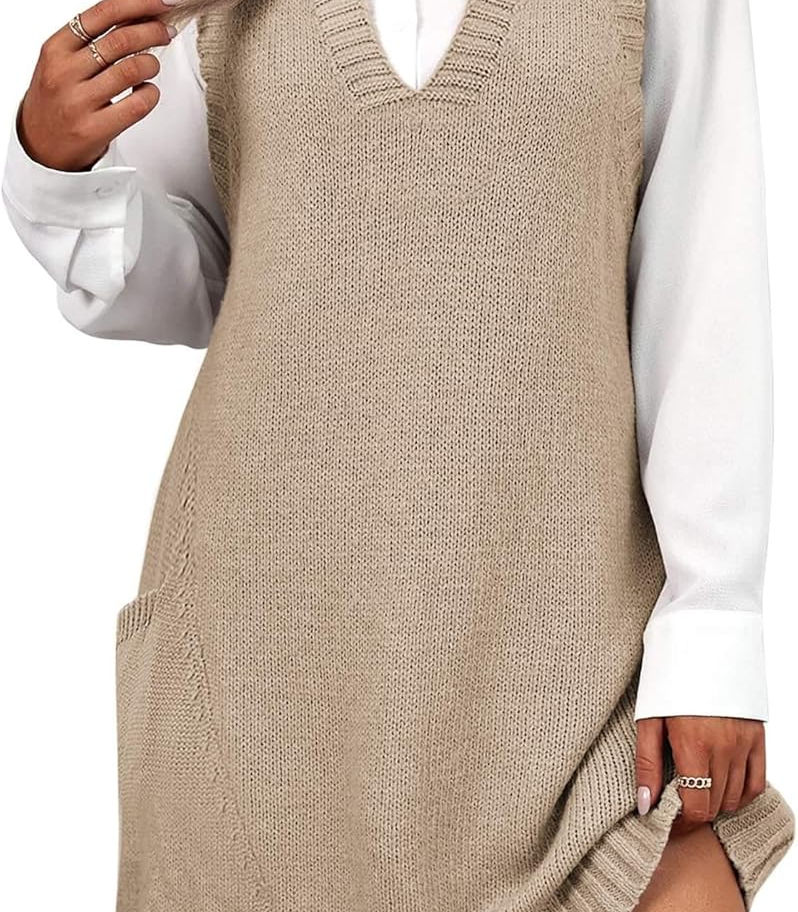 Material: este vestido suéter tipo chaleco sin mangas con cuello en V está hecho de tela 100% acrílica de punto suave, que es muy cómoda y agradable al tacto; el estilo casual y de gran tamaño hace que se adapte a todas las formas, no se pega incómodamente en cualquier lugar, no se encoge.