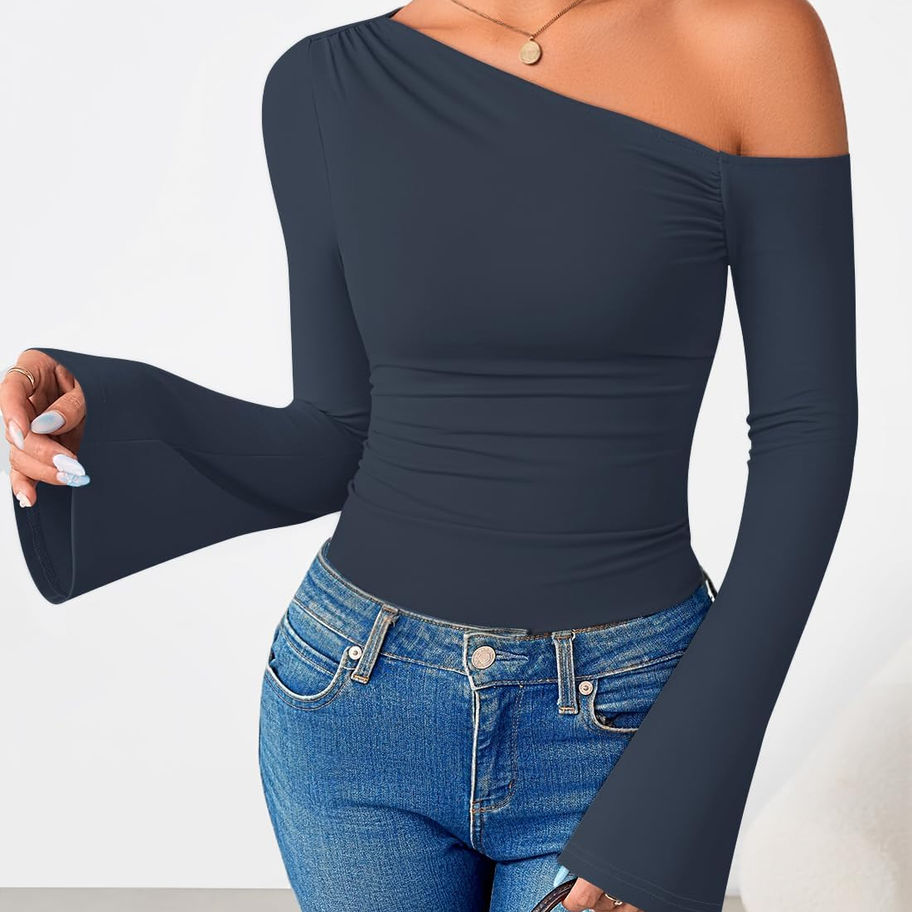 Diseño: esta camiseta ajustada cuenta con un diseño de un solo hombro para favorecer tu clavícula y realzar el encanto femenino con un estilo clásico pero elegante. Las modernas mangas acampanadas son llamativas mientras que permiten libertad de movimiento para las muñecas. Mejora tu gusto de moda de otoño con esta elegante blusa