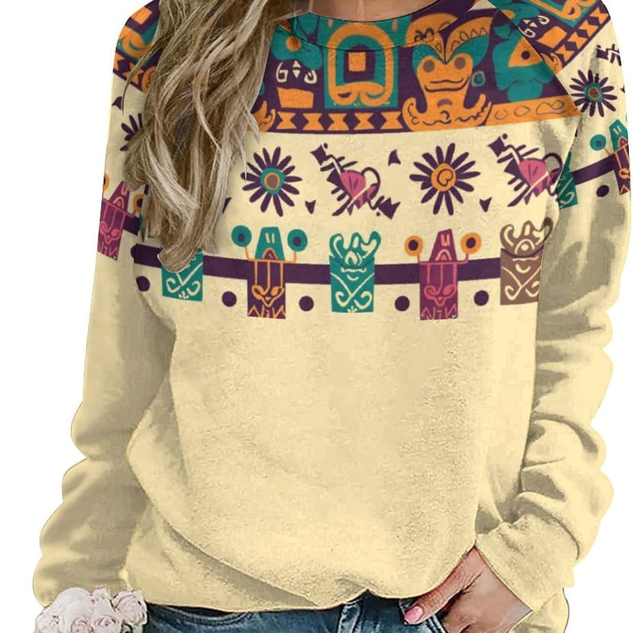 PRACKAGE INCLUYE: Recibirás 1 camisa de jersey con estampado azteca para mujer. Ajuste regular, equilibrio perfecto entre favorecedor y suelto, adecuado para la mayoría de las mujeres. Camisas de calle de cuello redondo para mujer, camisetas gráficas de vaquero vintage para mujer, sudadera de vaquero occidental para mujer, sudadera étnica azteca sin capucha, sudadera de calabaza de calavera de Halloween para mujer, sudadera ligera para mujer, sudadera con capucha de cuello redondo para mujer