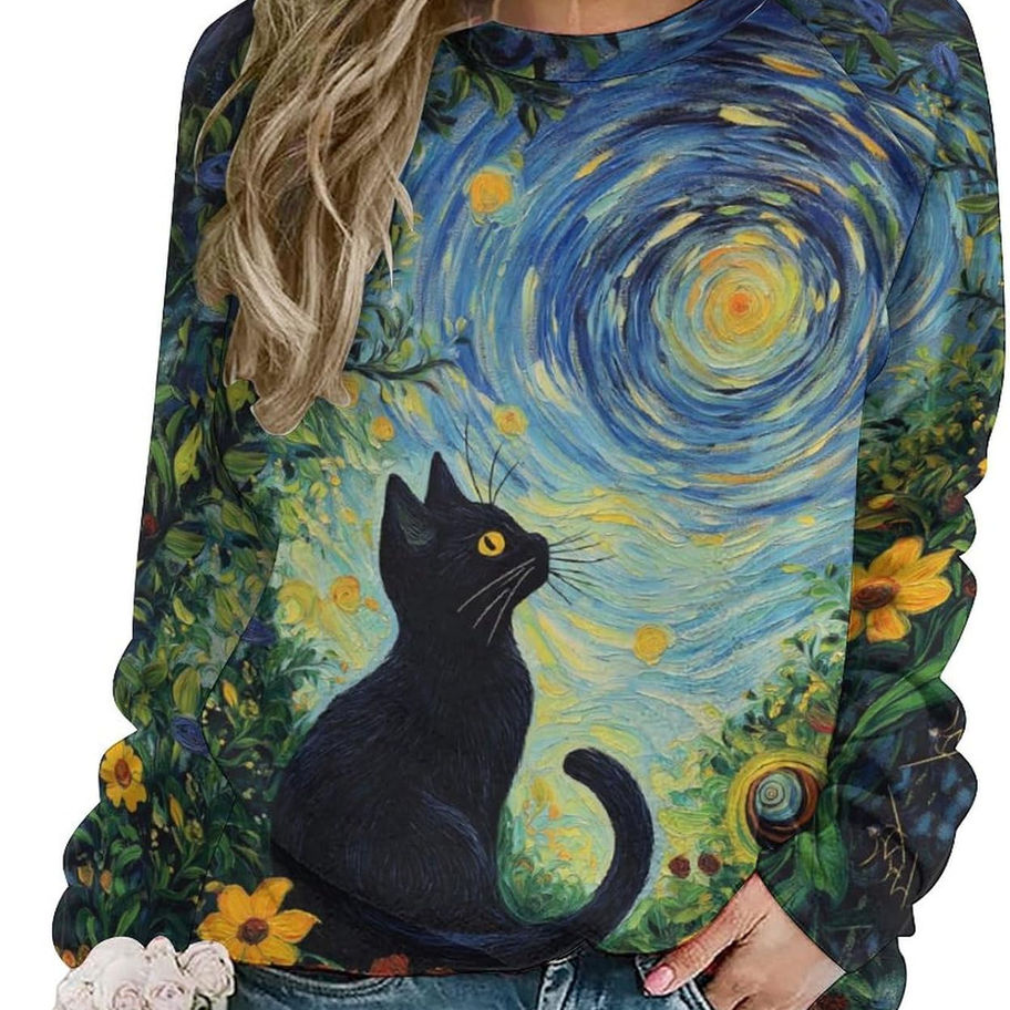 Tela: las sudaderas de gato casuales de otoño de Y2k para mujer están hechas de tela de mezcla de algodón de alta calidad, suave y agradable al tacto, ligeras y transpirables, duraderas y fáciles de llevar y lavar, cómodas de llevar, adecuadas para la mayoría de las mujeres. Sudadera de gato lindo para mujer, camisas impresas con gatos occidentales, sudadera de gato de Halloween para mujer